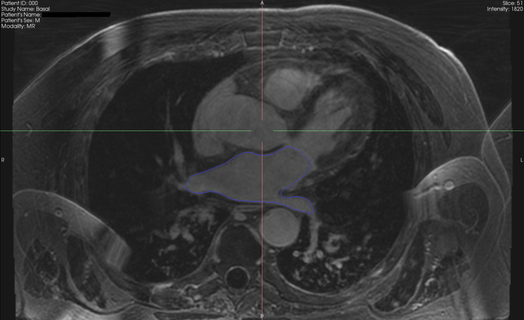 Before I started with the contour, however, I had to get my eyes used to the anatomy of the heart in Cardiac Magnetic Resonance (CMR) images in order to locate the left atrium. In the image on the right we can see the heart in the transverse plane. Which structures can you differentiate? I am still getting used to these CMR images, but it is possible to differentiate the aorta, right and left ventricles, the right atrium and left atrium with the left inferior and right superior pulmonary veins.