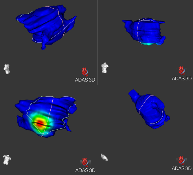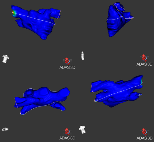 Once you can locate yourself in the heart anatomy is when the contouring starts. This is the moment when you realise you should have payed more attention as a kid. If you check again the previous image you can see something that perhaps is difficult to notice at a first glance. If you force your sight, you will see how I contoured with a blue line the inferior left cavity of the heart seen in the image, which corresponds to the left atrium. This line will help to segment this structure using ADAS 3D software, because to perform segmentation with this software it is necessary to draw the contour around the left atrium on several slices. Thanks to the software capability to interpolate the contour around several slices, we don’t need to contour the structure on each slice. And I can tell you, from my side, I need to say thank you for that, because due to my contouring skills I need some time to perform the segmentations.