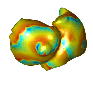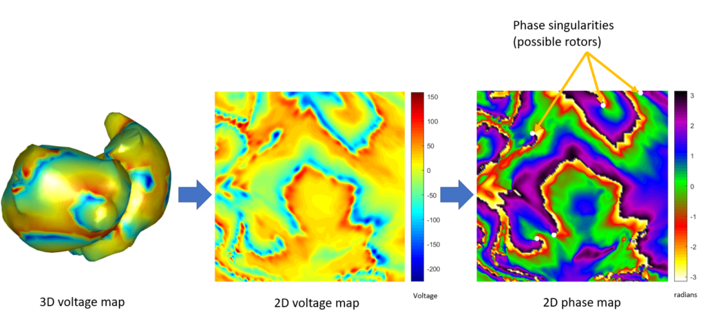 Regarding my progress in this difficult task, so far I have managed to transform 3 dimensional map representations (like the one shown above) into images. The main reason for doing so is that, using images we have available tones of well known and optimized image processing algorithms that can help us to identify rotors. Besides, once the 3D to 2D transformation is known, going from 3D maps to images and vice versa is fast and trivial. I have already implemented an algorithm that is able to find rotors on these images using phase maps. These are an alternative representation of the voltage maps in time domain, that encode the stage of the electrical cycle using angles. I know it is confusing, but it is very handy if you want to localize rotational patterns around a point. I will leave it here before getting to boring, and giving you a nice image that describes (to some extend) the process. The next step will be to improve the rotor tracking along time and compare the obtained results with the algorithm already available in the lab (those I am trying to improve).