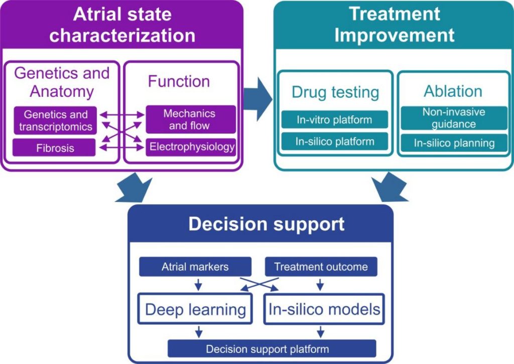 WP3 will be focused on providing the best diagnostic and therapeutic option in an easy-to-use support decision platform for the hospital environment that will integrate the collection of patient-specific biomarkers, the classification of the patient in the different disease sub-phenotypes and the election of the best therapy option. This platform will be trained with patient-specific data available in the hospitals of the consortium, as well as with novel clinical and simulated data provided by PersonalizeAF outcomes.