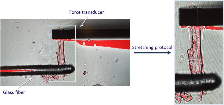 To be able to characterize how cells react to stretch during atrial fibrillation, the MyoStrecher System comes in handy. In simple words, it consists in attaching the cell with two probes, pull them apart and record cell response (Figure 1). Stretch in the atria induces different electrophysiological changes and it is connected with an increase in force production, which makes stretching experiments relevant despite the pathology under investigation. Just to give you an idea of how powerful a tool like this can be, it allows applying a preload and control afterloads, this while imaging a single cell. In general, when we stretch cells, we simulate the effect that the surrounding cells and ECM have on one single cell in the tissue as in their native environment a cell never contracts freely.